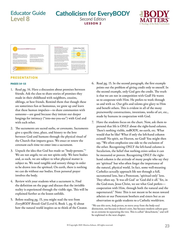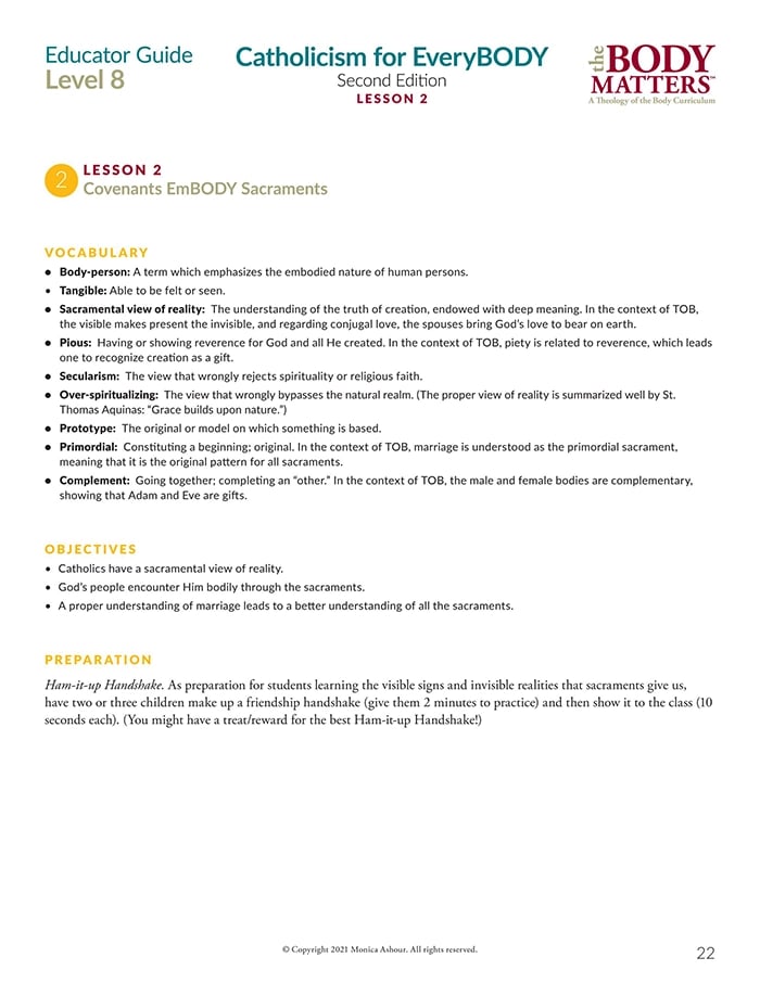 The L8-B2 Educator Guide aligns with The Body Matters Level 8 Lesson Book 2: Catholicism for EveryBODY, 2nd ed.