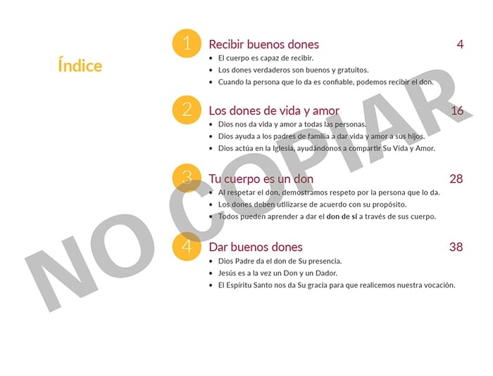 Este libro enseña cómo las personas debemos recibir nuestro cuerpo como un don de Dios. Luego, a través del don de nuestro cuerpo, ¡podemos dar y recibir otros dones! A través de los sentidos, el cuerpo recibe dones como la música, los sacramentos y los regalos de cumpleaños. Una persona también da dones como abrazos, jonrones y ayuda con quehaceres. Dios da vida y amor a todas las personas, lo que significa que el cuerpo en sí es un don del mejor Dador de dones. Nuestro cuerpo es don para dar a otros. Cuando los niños entienden que ellos mismos tienen muchos dones, esto transforma sus vidas.