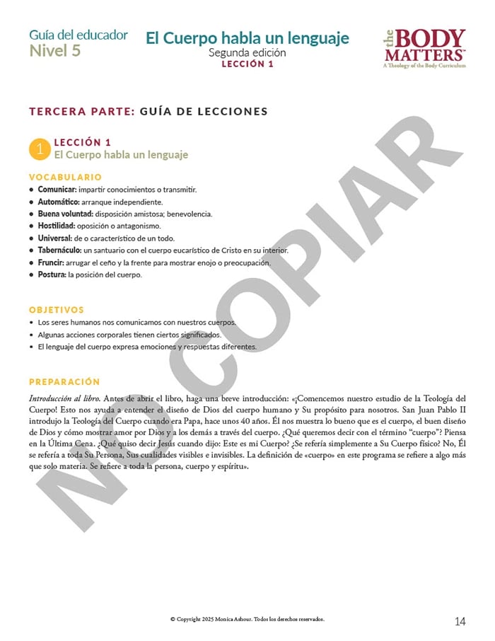 The Guía del educador is the essential teaching resource for The Body Matters program. It provides the educator detailed instructions for teaching each lesson, offers suggested enrichment activities, and includes straightforward assessments. The Guía del educador empowers the instructor to teach The Body Matters program successfully and does not assume one has any prior familiarity with Theology of the Body.