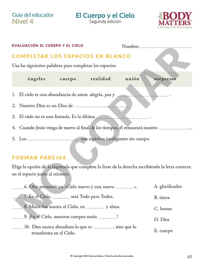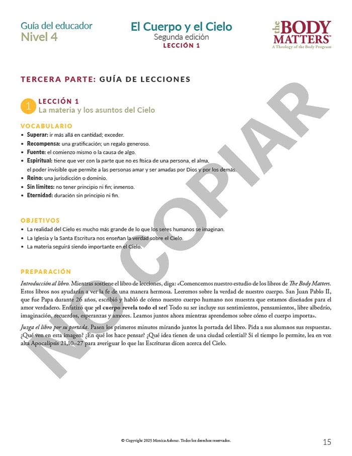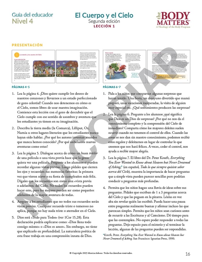 The Guía del educador is the essential teaching resource for The Body Matters program. It provides the educator detailed instructions for teaching each lesson, offers suggested enrichment activities, and includes straightforward assessments. The Guía del educador empowers the instructor to teach The Body Matters program successfully and does not assume one has any prior familiarity with Theology of the Body.