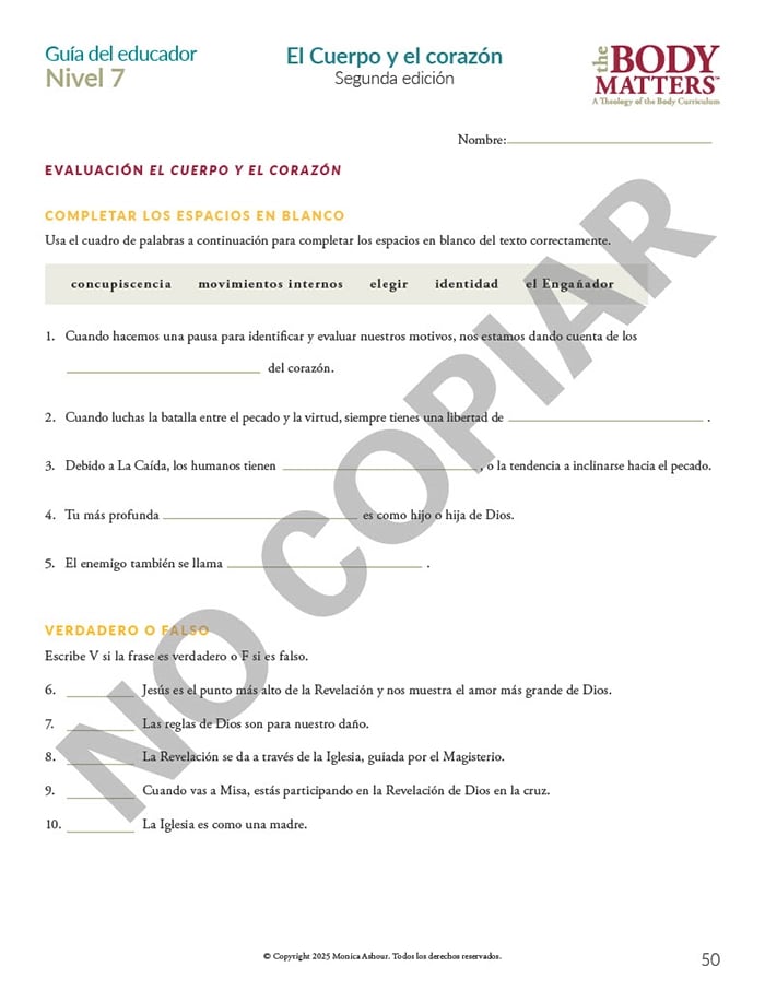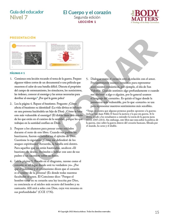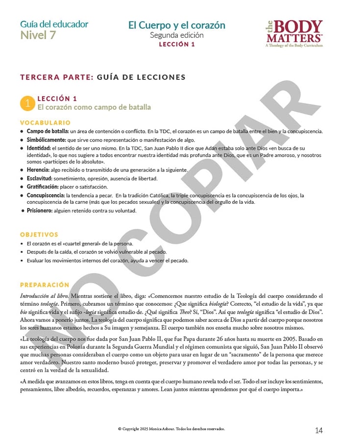 The Guía del educador is the essential teaching resource for The Body Matters program. It provides the educator detailed instructions for teaching each lesson, offers suggested enrichment activities, and includes straightforward assessments. The Guía del educador empowers the instructor to teach The Body Matters program successfully and does not assume one has any prior familiarity with Theology of the Body.