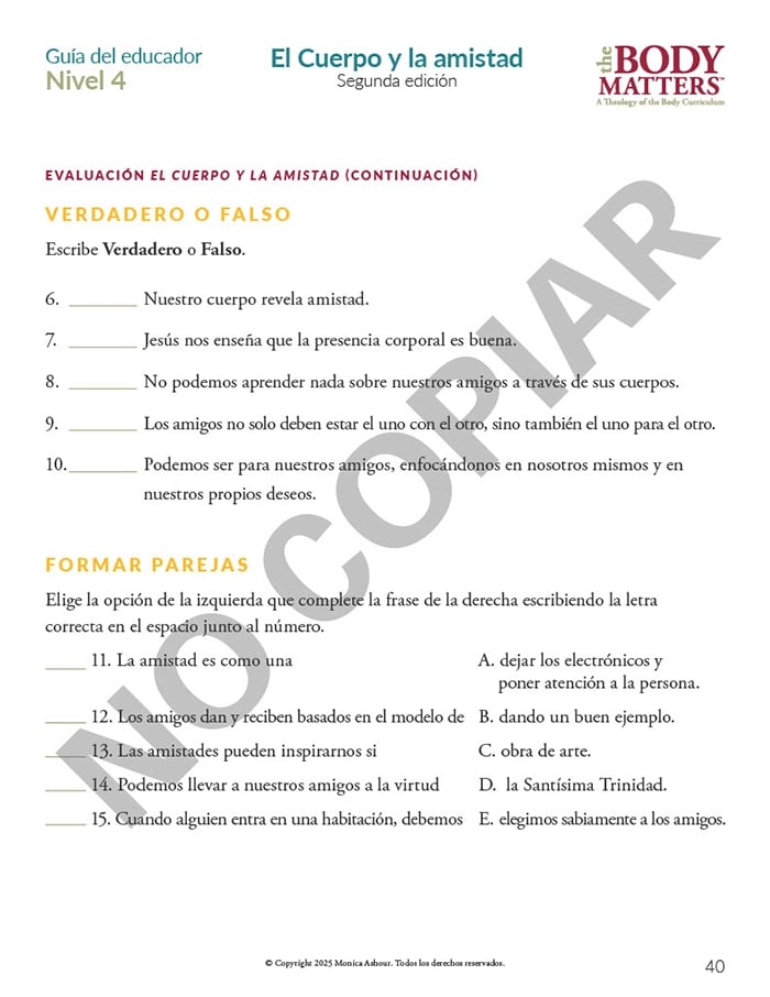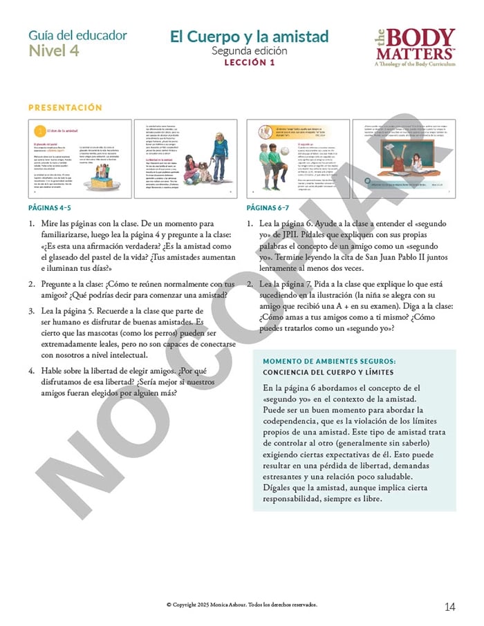 The Guía del educador is the essential teaching resource for The Body Matters program. It provides the educator detailed instructions for teaching each lesson, offers suggested enrichment activities, and includes straightforward assessments. The Guía del educador empowers the instructor to teach The Body Matters program successfully and does not assume one has any prior familiarity with Theology of the Body.