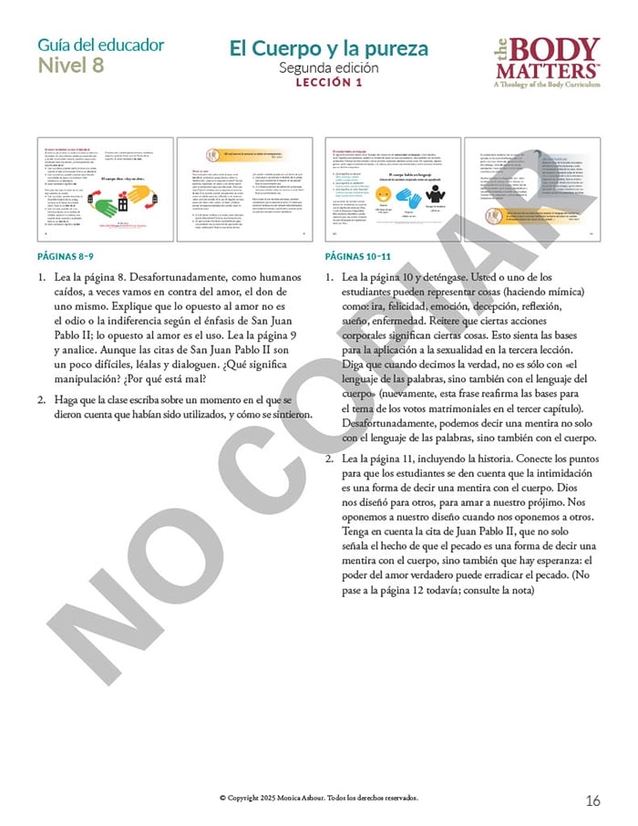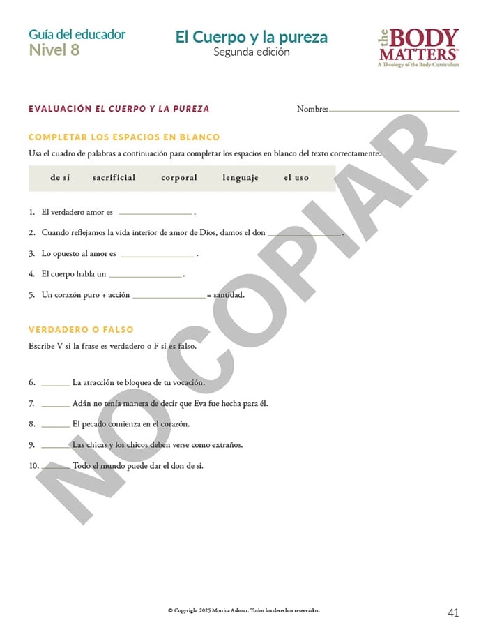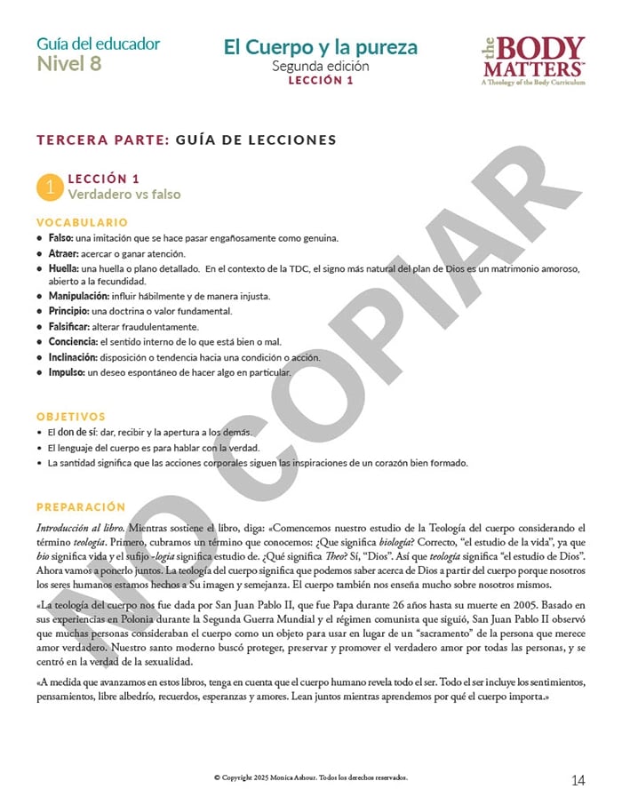 The Guía del educador is the essential teaching resource for The Body Matters program. It provides the educator detailed instructions for teaching each lesson, offers suggested enrichment activities, and includes straightforward assessments. The Guía del educador empowers the instructor to teach The Body Matters program successfully and does not assume one has any prior familiarity with Theology of the Body.
