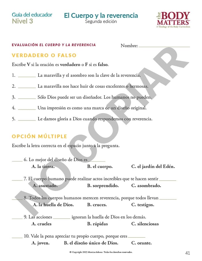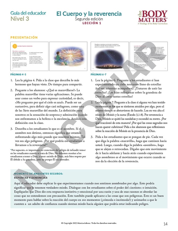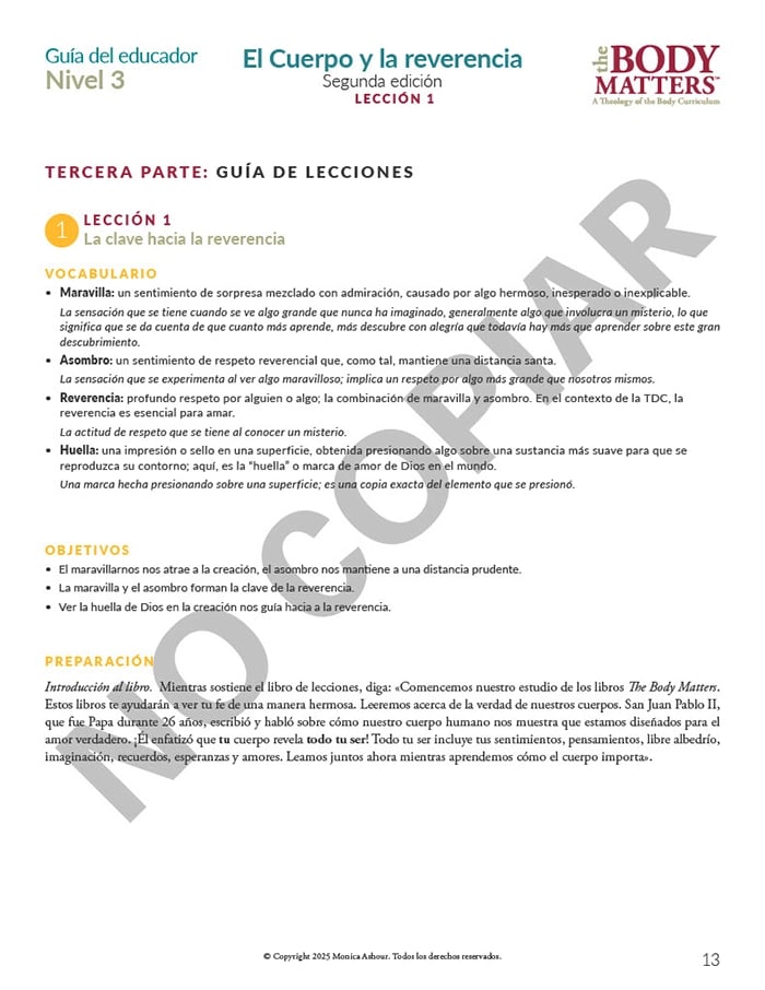 The Guía del educador is the essential teaching resource for The Body Matters program. It provides the educator detailed instructions for teaching each lesson, offers suggested enrichment activities, and includes straightforward assessments. The Guía del educador empowers the instructor to teach The Body Matters program successfully and does not assume one has any prior familiarity with Theology of the Body.