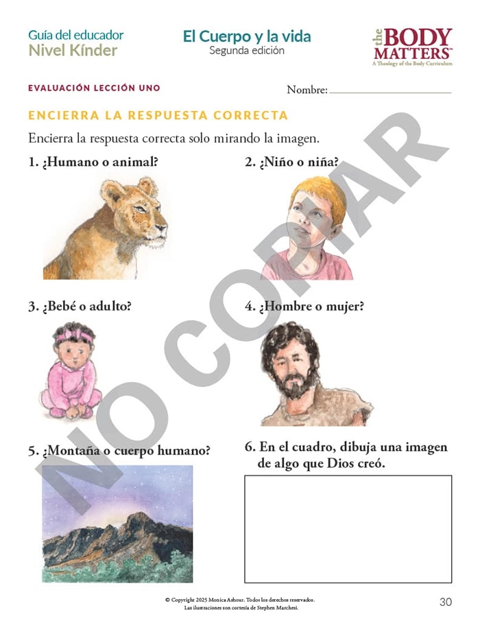 The Guía del educador is the essential teaching resource for The Body Matters program. It provides the educator detailed instructions for teaching each lesson, offers suggested enrichment activities, and includes straightforward assessments. The Guía del educador empowers the instructor to teach The Body Matters program successfully and does not assume one has any prior familiarity with Theology of the Body.