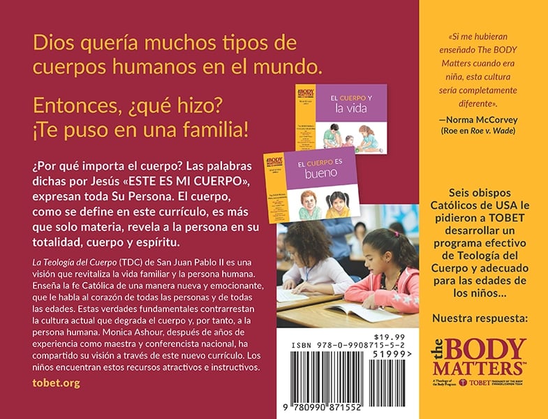 La Teología del Cuerpo es un enfoque completo y hermoso de la verdad del cuerpo y su significado. En una cultura donde el cuerpo es considerado «enemigo de la libertad», la Teología del Cuerpo de San Juan Pablo II es más necesaria que nunca. La serie de libros de lecciones The Body Matters enseña las verdades sobre el cuerpo de una manera accesible y apropiada para la edad. Es un gran recurso para los padres, los programas de formación en la fe y las escuelas católicas, para ayudar a los niños a ver la santidad del cuerpo. Aquí se pueden encontrar las enseñanzas de San Juan Pablo II sobre el cuerpo en un lenguaje accesible para los niños, con hermosas ilustraciones, ejemplos prácticos y una sólida teología católica.