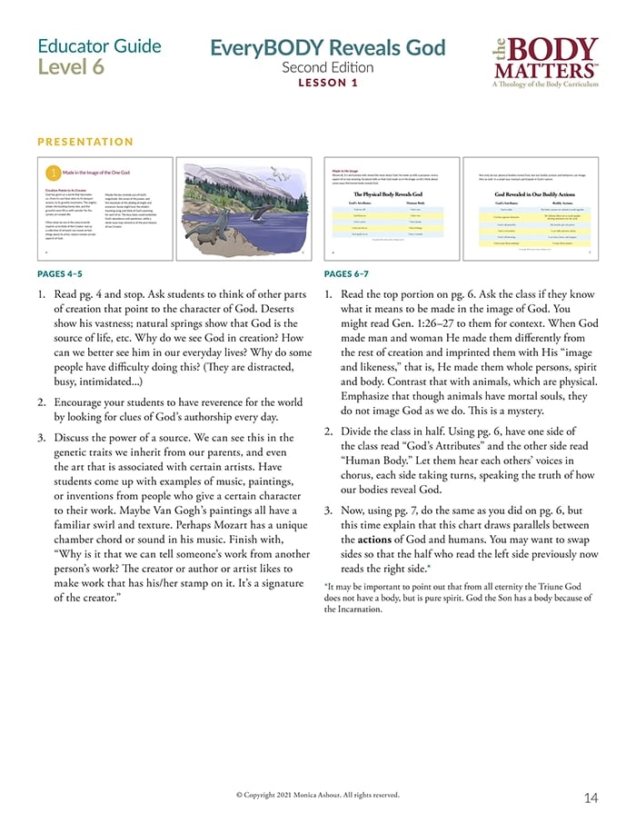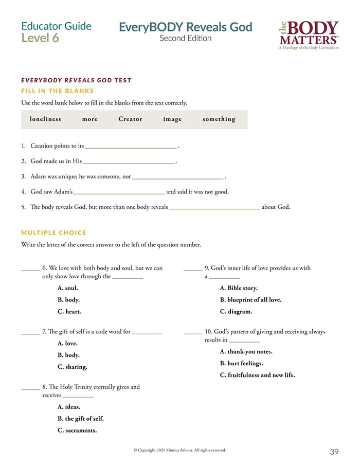 The Educator Guide is the essential teaching resource for The Body Matters program. It provides the educator detailed instructions for teaching each lesson, offers suggested enrichment activities, and includes straight-forward assessments. The Educator Guide empowers the instructor to teach The Body Matters program successfully and does not assume one has any prior familiarity with Theology of the Body.
