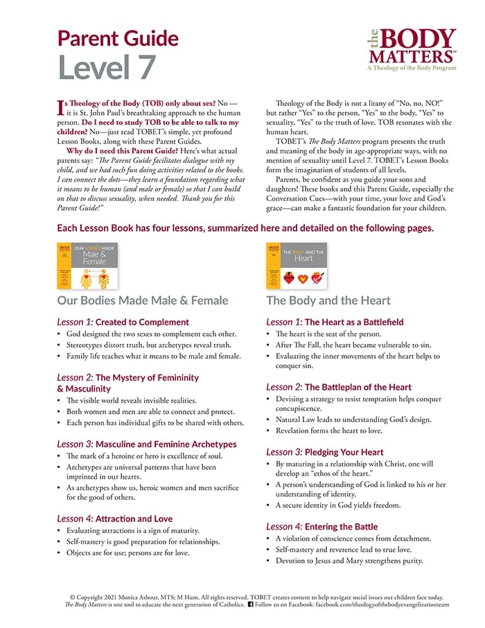 The Level 7 Parent Guide aligns with The Body Matters Level 7 Books 1 & 2: Our Bodies Made Male and Female, 2nd ed. & The Body and the Heart.