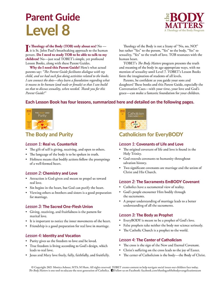 Especially relevant today, as children are being inundated with false notions of the body, identity, and gender, The Body Matters program offers young people a message of hope and the light of truth by drawing upon the wisdom found in St. John Paul’s Theology of the Body. The Body Matters presents these teachings in an easy-to-understand and age-appropriate way. For more information on The Body Matters, click here.