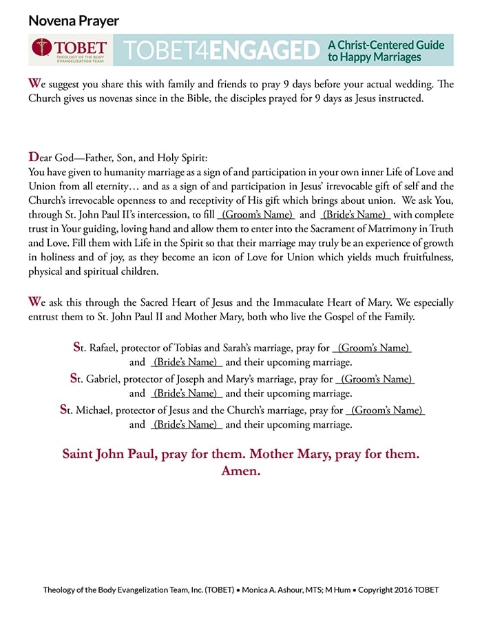 A novena to pray for engaged couples leading up to their wedding.