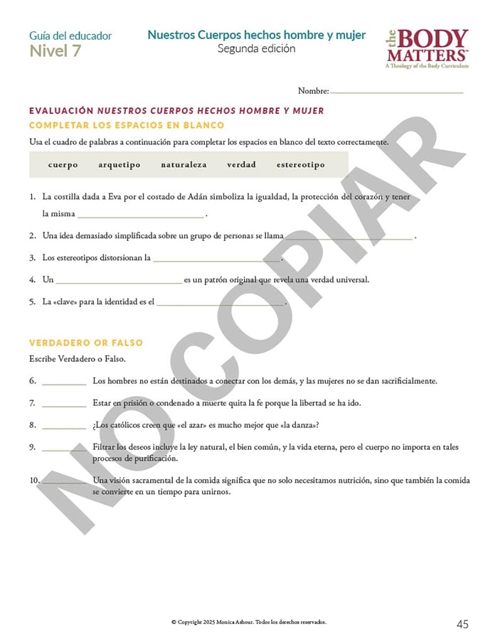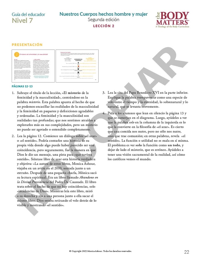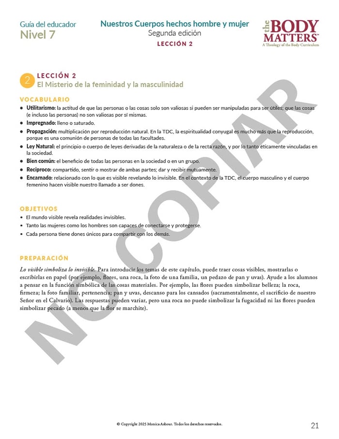 The Guía del educador is the essential teaching resource for The Body Matters program. It provides the educator detailed instructions for teaching each lesson, offers suggested enrichment activities, and includes straightforward assessments. The Guía del educador empowers the instructor to teach The Body Matters program successfully and does not assume one has any prior familiarity with Theology of the Body.