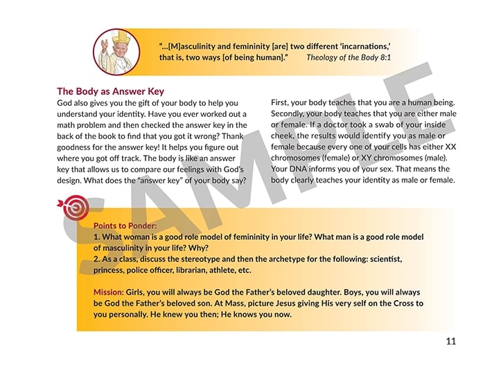 In a culture that denies human embodiedness, this vital book forms youth to understand and embrace the complementarity of masculinity and femininity. Rather than trite stereotypes, this book equips children with the sacramental view of reality that permeates creation, particularly in being made male or female. Heroic women and men live the truth of their calling. Finally, teens learn how to navigate feelings of attraction and how to understand real love and its opposite: use.