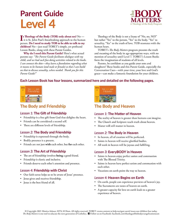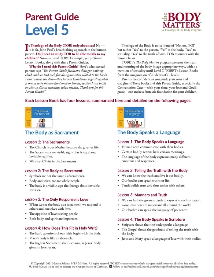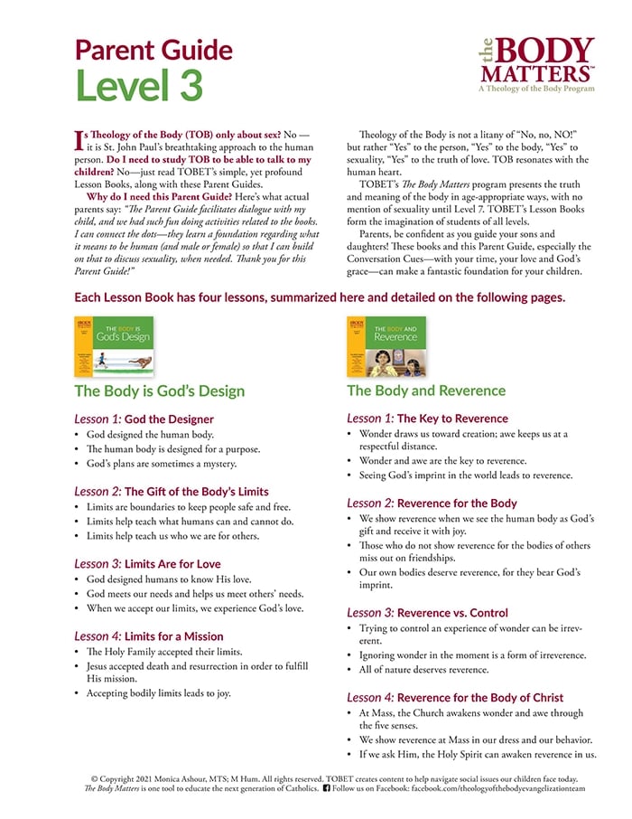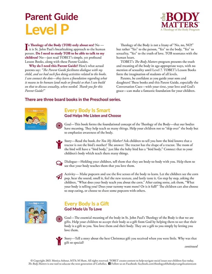 TOBET is pleased to announce the release of our new Parent Guides which are to be used in conjunction with each of our lesson books for the Pre-K— Level 8 program known as The Body Matters. To be used for family catechesis or in conjunction with Faith Formation and/or Catholic schools or homeschool, these guides will equip parents in discussing various topics with their children.