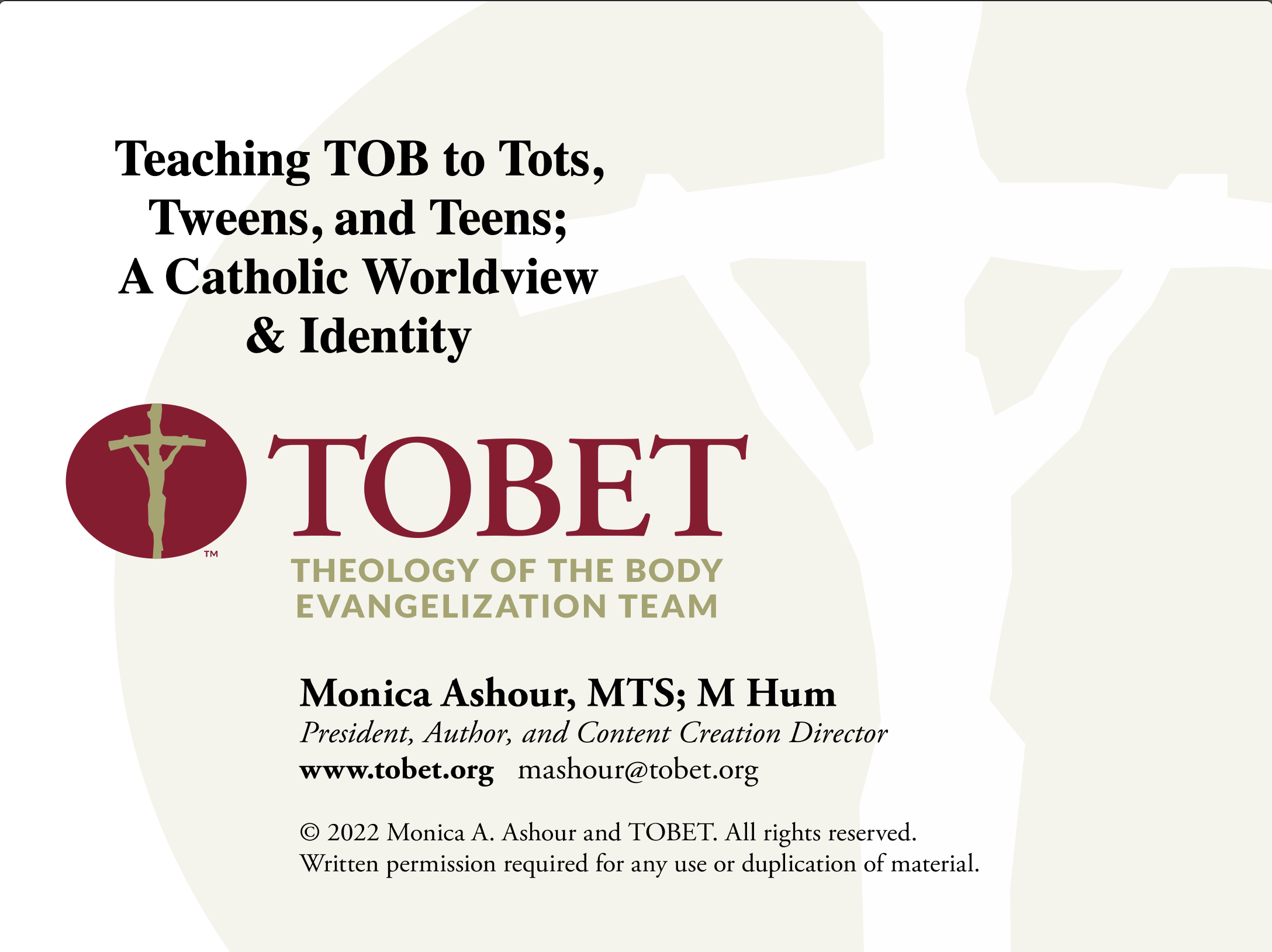 - Teaching TOB to Tots, Tweens and Teens; A Catholic Worldview & Identity