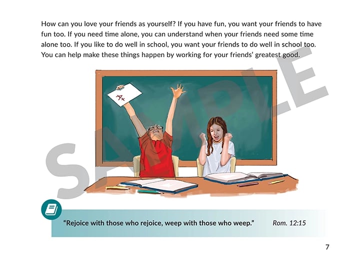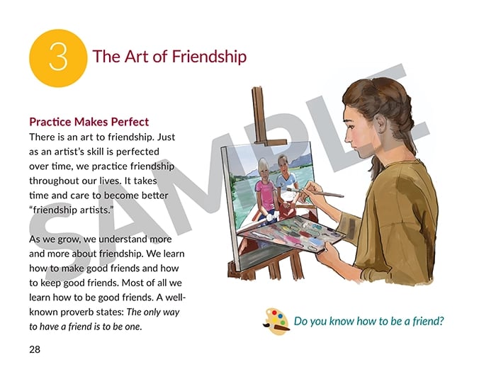 This book teaches how friendships are the icing on the cake of life. There are different levels of friendship. Children learn to approach friendships as gifts to enjoy. They learn to be “for” another person, interested in the good of the other person. Good human friendships mirror the friendship we have with Jesus.