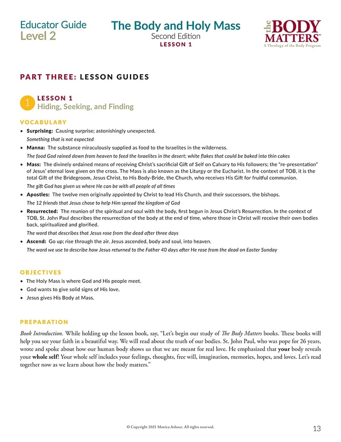 The Educator Guide is the essential teaching resource for The Body Matters program. It provides the educator detailed instructions for teaching each lesson, offers suggested enrichment activities, and includes straight-forward assessments. The Educator Guide empowers the instructor to teach The Body Matters program successfully and does not assume one has any prior familiarity with Theology of the Body.