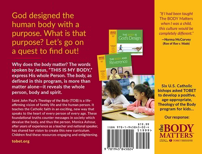 The Theology of the Body is a positive, beautiful approach to the truth of the body and its meaning. In a culture where the body is considered “an enemy to freedom,” Saint John Paul’s Theology of the Body is necessary more than ever. The Body Matters lesson books series teaches the truths about the body in an accessible, age-appropriate way. It is a great resource for parents, Faith Formation programs and Catholic schools to help children see the sacredness of the body. Here you can find Saint John Paul’s teachings on the body rendered in language accessible to children, with beautiful illustrations, practical examples and solid Catholic theology.