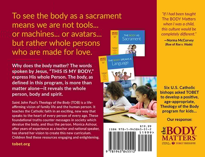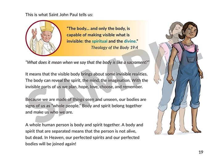 The Theology of the Body is a positive, beautiful approach to the truth of the body and its meaning. In a culture where the body is considered “an enemy to freedom,” Saint John Paul’s Theology of the Body is necessary more than ever. The Body Matters lesson books series teaches the truths about the body in an accessible, age-appropriate way. It is a great resource for parents, Faith Formation programs and Catholic schools to help children see the sacredness of the body. Here you can find Saint John Paul’s teachings on the body rendered in language accessible to children, with beautiful illustrations, practical examples and solid Catholic theology.