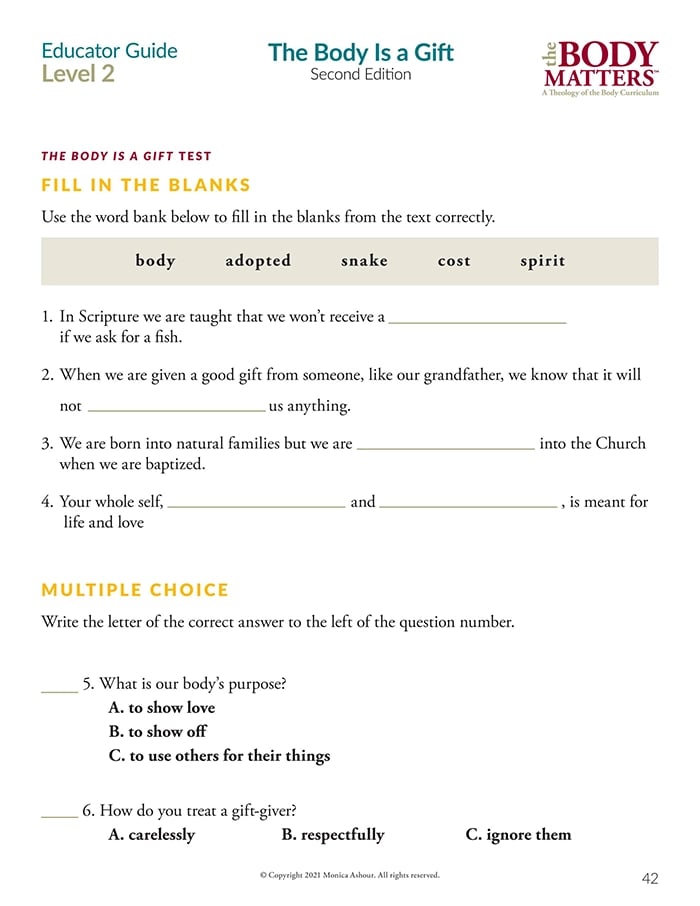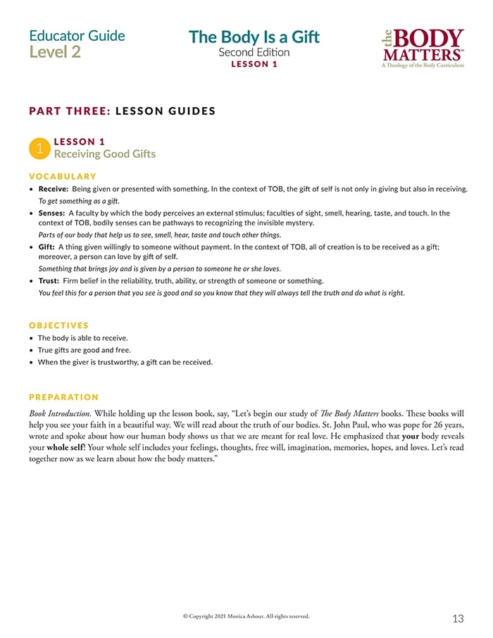 The Educator Guide is the essential teaching resource for The Body Matters program. It provides the educator detailed instructions for teaching each lesson, offers suggested enrichment activities, and includes straight-forward assessments. The Educator Guide empowers the instructor to teach The Body Matters program successfully and does not assume one has any prior familiarity with Theology of the Body.