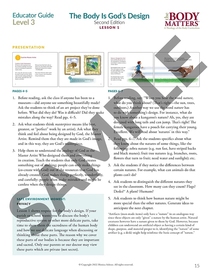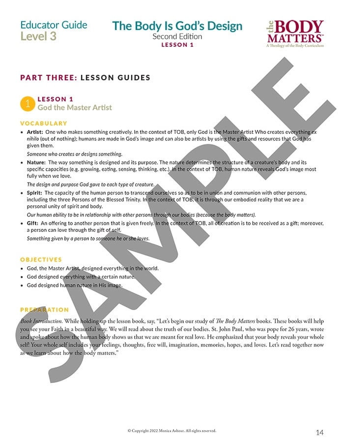 The Educator Guide is the essential teaching resource for The Body Matters program. It provides the educator detailed instructions for teaching each lesson, offers suggested enrichment activities, and includes straight-forward assessments. The Educator Guide empowers the instructor to teach The Body Matters program successfully and does not assume one has any prior familiarity with Theology of the Body.
