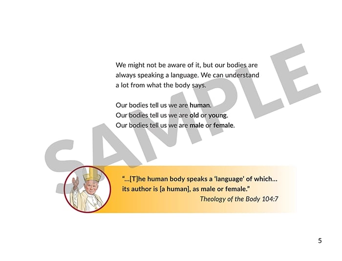 The Theology of the Body is a positive, beautiful approach to the truth of the body and its meaning. In a culture where the body is considered “an enemy to freedom,” Saint John Paul’s Theology of the Body is necessary more than ever. The Body Matters lesson books series teaches the truths about the body in an accessible, age-appropriate way. It is a great resource for parents, Faith Formation programs and Catholic schools to help children see the sacredness of the body. Here you can find Saint John Paul’s teachings on the body rendered in language accessible to children, with beautiful illustrations, practical examples and solid Catholic theology.