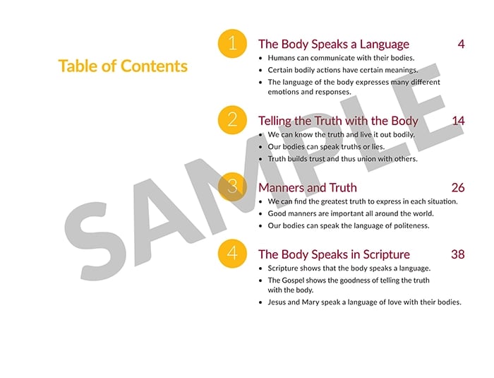 The actions of the body communicate like words do, and the body conveys truths, even through a handshake or a smile. However, the body can also convey falsehoods, as when Judas betrayed Jesus with a kiss. Children learn that manners show kindness and respect with bodily actions. Scripture reveals the fullness of the language of the body through the lives of Jesus and Mary.