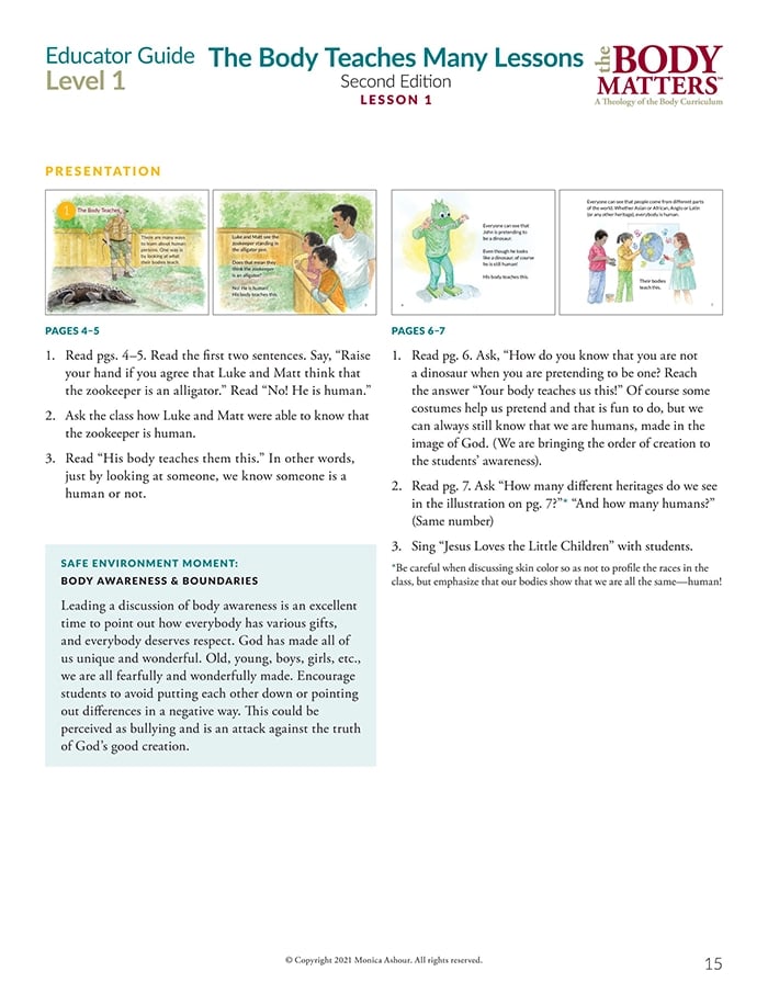 The Educator Guide is the essential teaching resource for The Body Matters program. It provides the educator detailed instructions for teaching each lesson, offers suggested enrichment activities, and includes straight-forward assessments. The Educator Guide empowers the instructor to teach The Body Matters program successfully and does not assume one has any prior familiarity with Theology of the Body.
